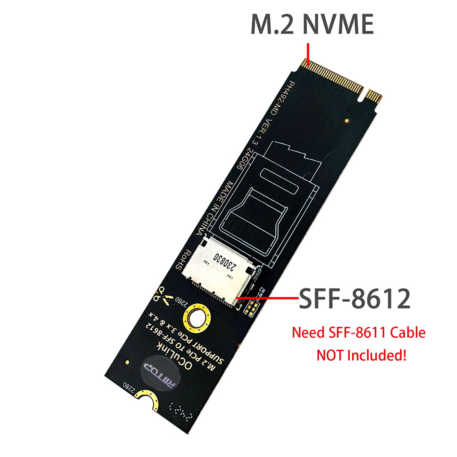 RIITOP SFF-8612 to NVMe Card allows you expand an OCuLink SF-8611 4i Host via M.2 PCIe NVMe Socket, to connect eGPU or U.2 U.3 SSD.